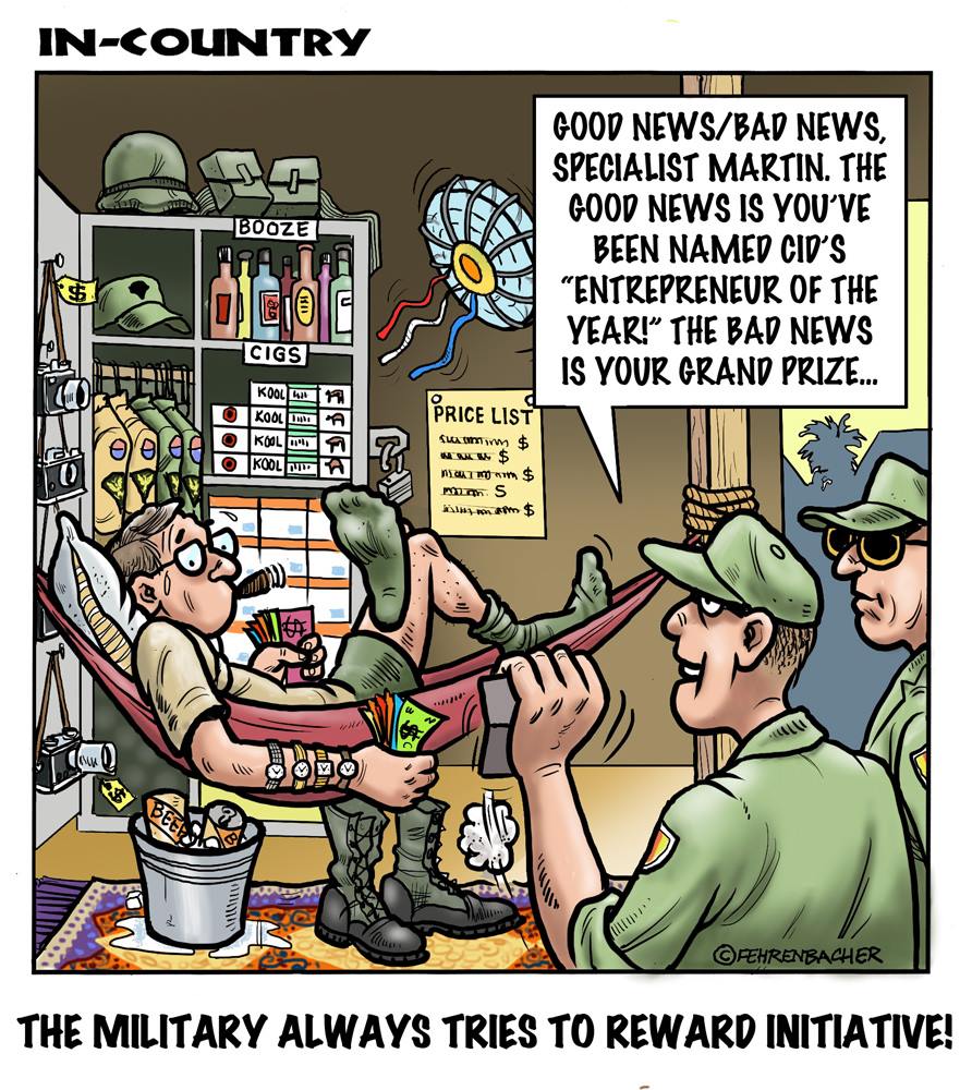 Phil enlisted in the Army in 1965 where he served for years in Vietnam.  He became a graphic designer and has worked for the state of Oregon for 26 years.  He retired in 2003 and started the Cartoon "In-Country".  The cartoons reflect his experiences during his tour of duty in South Vietnam.